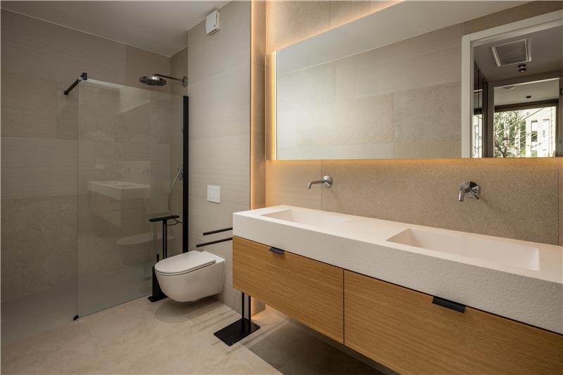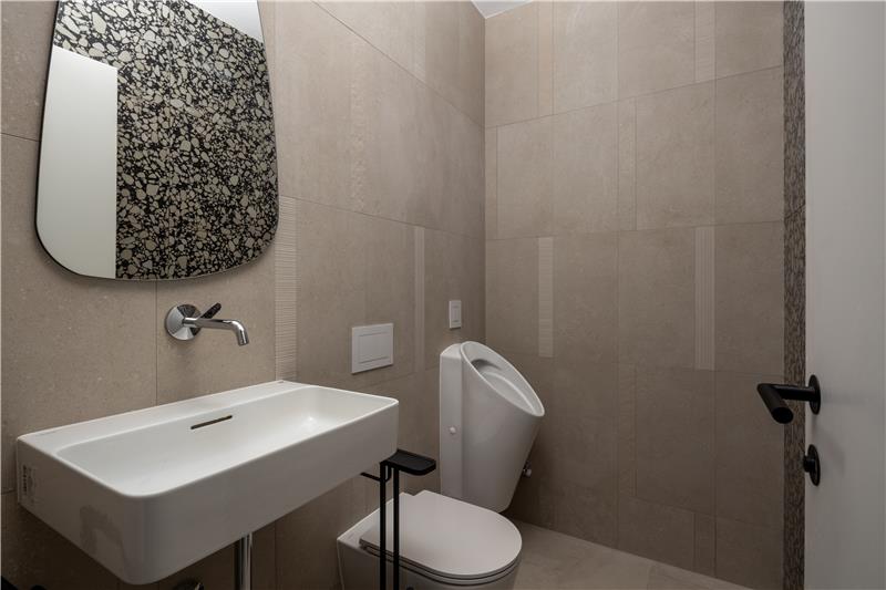 The lower ground floor is dedicated to wellness and practical comfort featuring a fitness room, Finnish sauna, shower/WC, and a utility room.