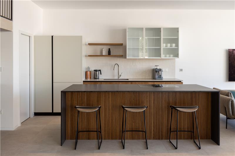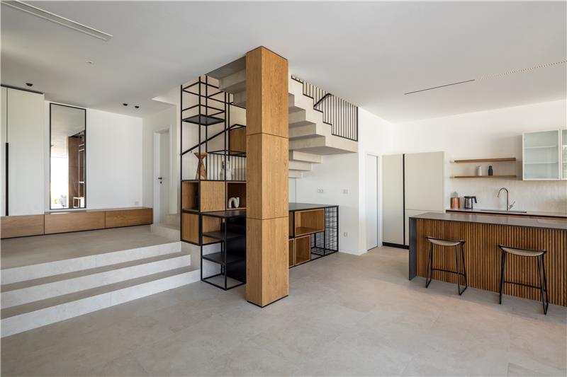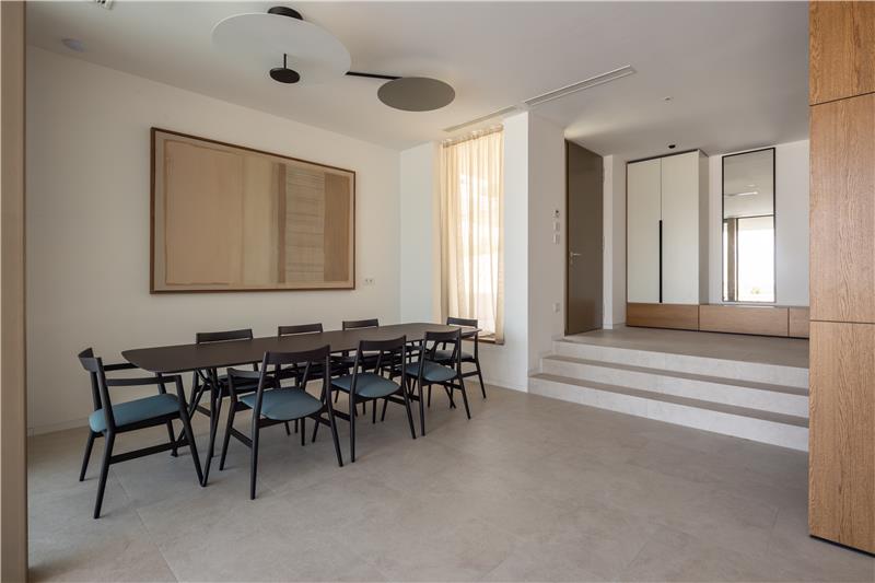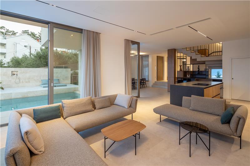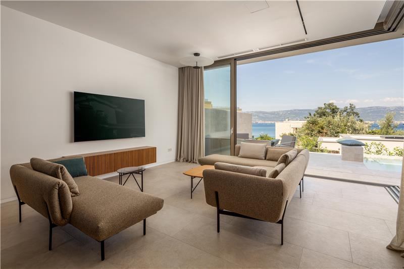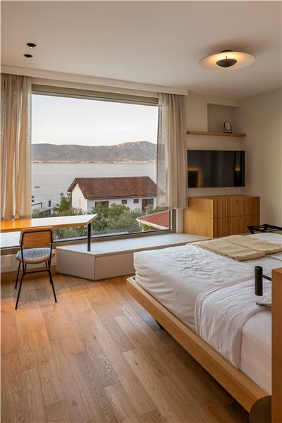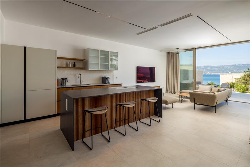 Located on Ciovo island—connected to the mainland by bridge—the villa sits within a small, private resort enclave of individual villas and is semi-detached with villa TG138. Guests approach via the coastal road, covered parking is located at the rear. Entry from the parking area leads into a spacious split-level open-plan kitchen, dining, and living area with with views over the pool and partial views toward the Adriatic. This floor also has a guest WC. From the living area large sliding doors open directly onto the pool terrace where guests can enjoy a heated pool, shaded lounge areas and immediate access down a short pathway to the beach.