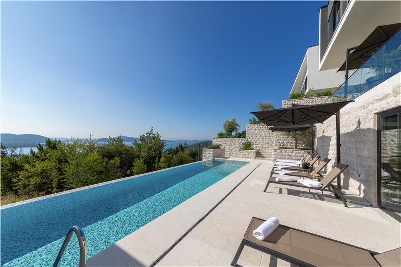 Furniture in terrace/balcony/garden: Dining table and chairs, sun loungers around pool and on balcony plus deck chairs