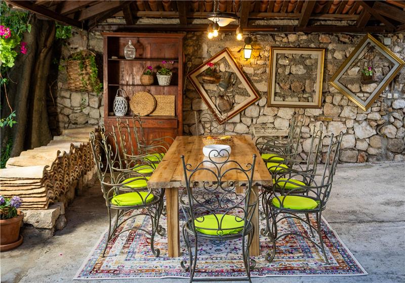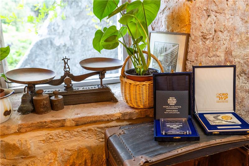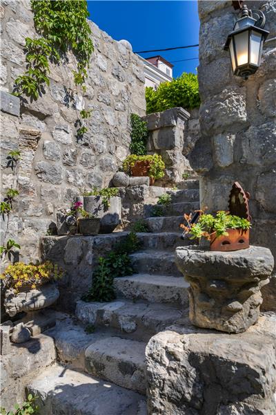 The property is approached through secure gates leading to a terraced garden filled with citrus and olive trees, lavender, and rosemary, offering a series of peaceful corners for reading, conversation, or quiet reflection. On the ground floor guests will find a self-contained apartment featuring a double bedroom, en suite shower room, and a kitchen—ideal for accompanying staff or visitors seeking independence. The ground floor also features an events room, set in the stone walls of the property it offers a sheltered space to eat, meet and relax whilst blending seamlessly into the garden. A wooden staircase connects all floors, its walls adorned with local artworks and family memorabilia that tell the story of the Baković family.