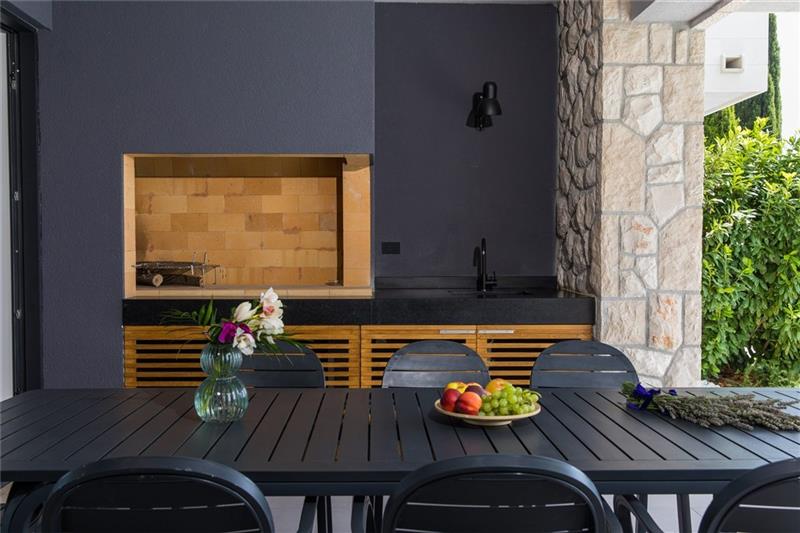 Ground floor: This floor is designed for socialising and relaxation and has an open plan lounge, dining and kitchen area that opens out through sliding doors to the pool and terrace. On the terrace and accessed from the kitchen/dining area there is a summer kitchen with BBQ and dining area for guest to enjoy al fresco dining. This floor also has a guest WC.The villa sits adjacent to Villa DU342 and the two can be rented together to accommodate up to 20 guests. A private chef can be arranged, with fine dining for 20 available on one of the terraces.