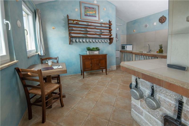 Ground floor: Accessed via a covered terrace opening into an entrance hall with separate sitting room featuring a traditional Istrian fireplace, and some choice early Bauhaus furniture. Opposite the sitting room is a large country kitchen with dining table for 6 persons with the possibility to add 4 extra chairs. There is also a guest cloakroom with WC on this level.