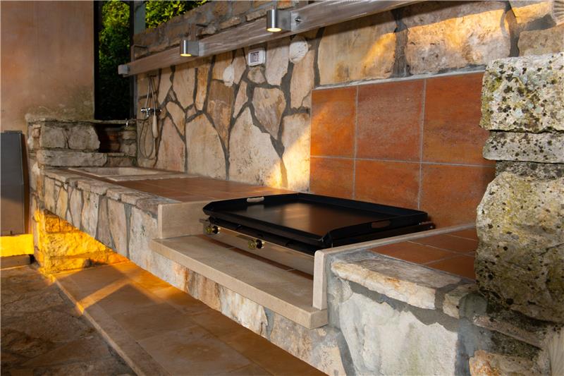 The pool and garden are accessed either via Stone House No.2 through a ground floor door located in the hallway or from a side gate situated near the entrance gate. This extensive outside area is broken into a variety of entertainment section interspersed with shrubbery and trees including a number of striking cypress trees. Guests can enjoy a game of table tennis, a children’s playground to keep the little ones occupied and a wonderfully spacious pool area with a larger than average pool featuring double Roman stairs entry and massage corner (additional charge for the massage corner- see separate charges box below). Next to the pool is a shower room/toilet , a covered outdoor eating patio, fully equipped blue summer kitchen including dishwasher and a smart lighting system for moving into the evening, perfect for your own private pool party.