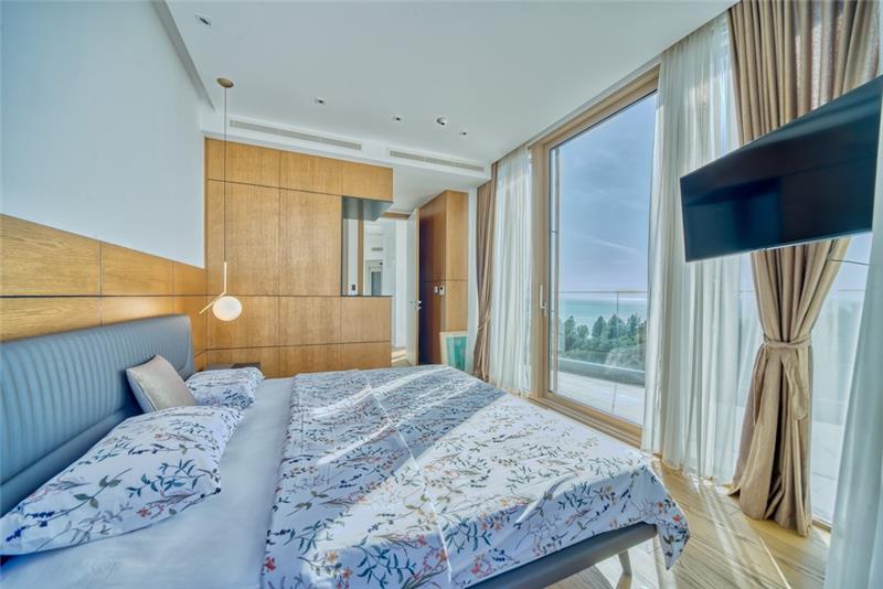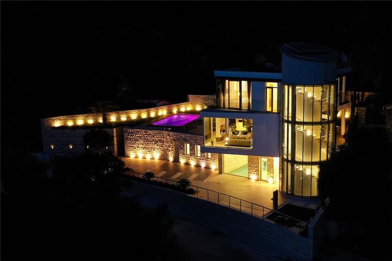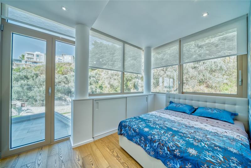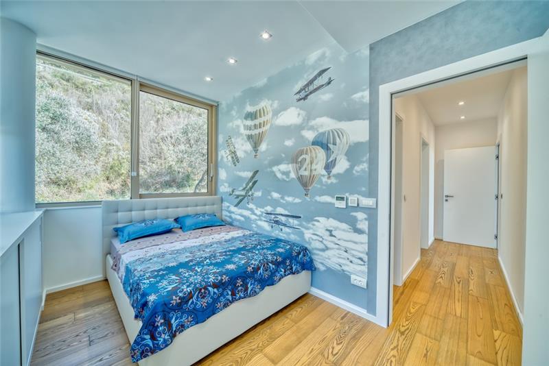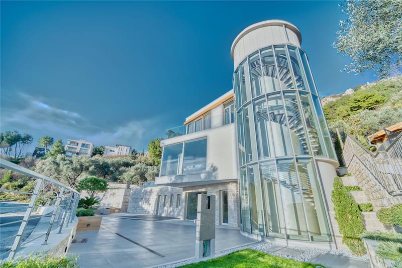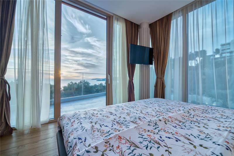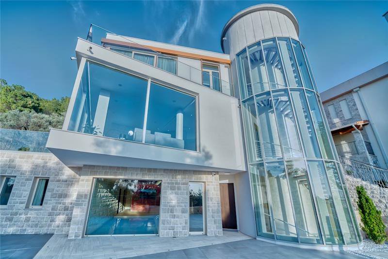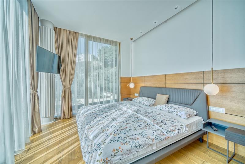 On arrival, guests will find ample parking in a spacious garage designed to accommodate four vehicles. Entering the villa on the ground floor, guests will find a one bedroom apartment with an ensuite shower room, a living room, dining room and kitchenette. There's also a well-equipped spa area, featuring an indoor pool, a Finnish sauna, hammam, guest WC, fitness area and a massage room. On the first floor there's an open plan living room, dining area and kitchen surrounded by floor to ceiling windows that offer sea views as well as direct access to the outdoor pool, this floor has a guest WC. A sea-view bedroom with ensuite shower is also located on this floor, providing a peaceful retreat. The second level of the villa is home to a double bedroom, offering breathtaking sea views through a glass wall, along with an en-suite shower room. This floor also features two children's bedrooms with single beds that share a bathroom with bath, and an additional king-sized bedroom with ensuite shower. There is a lift and spiral staircase to get you between floors and the top floor is dedicated to a stunning rooftop terrace, ideal for enjoying evening sunsets and panoramic views of the Budva Riviera. For those who enjoy staying active, pop down to the garage for a game of table tennis.