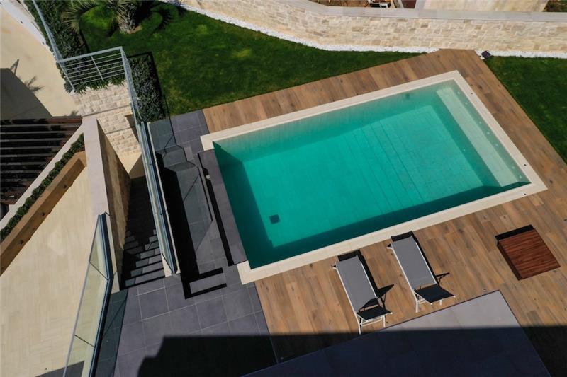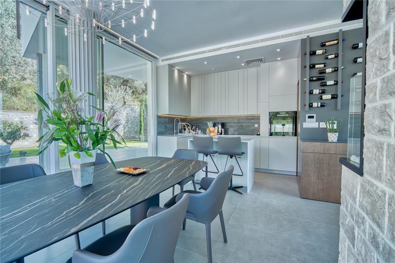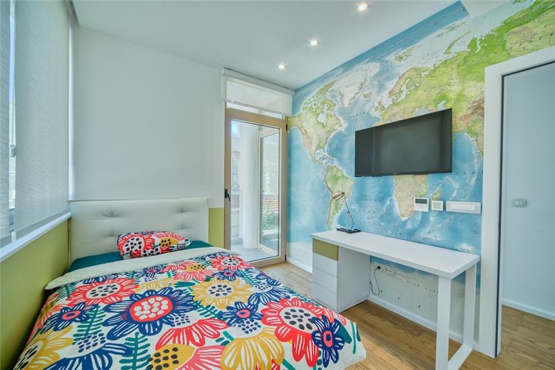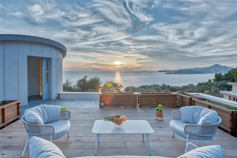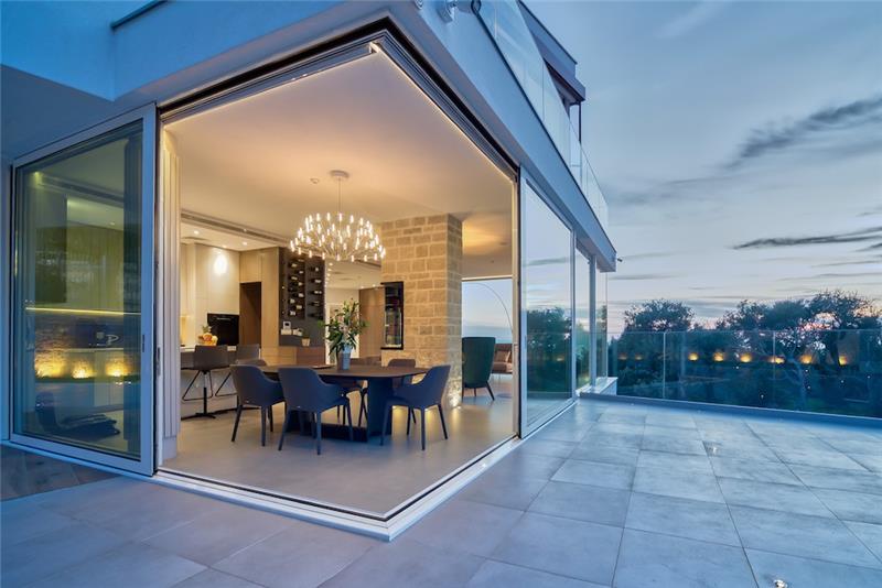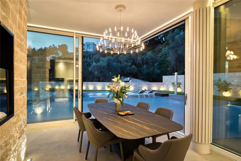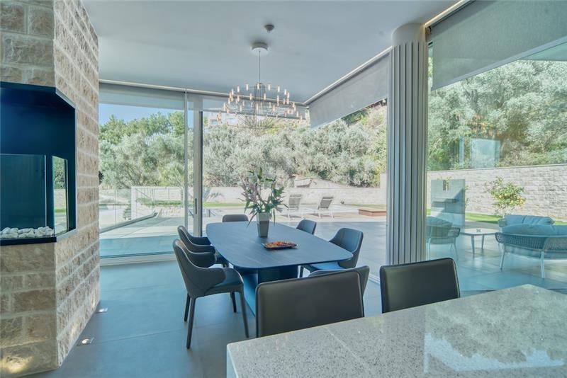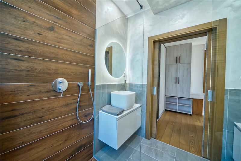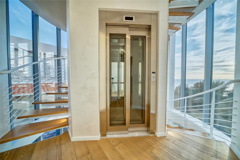 On arrival, guests will find ample parking in a spacious garage designed to accommodate four vehicles. Entering the villa on the ground floor, guests will find a one bedroom apartment with an ensuite shower room, a living room, dining room and kitchenette. There's also a well-equipped spa area, featuring an indoor pool, a Finnish sauna, hammam, guest WC, fitness area and a massage room. On the first floor there's an open plan living room, dining area and kitchen surrounded by floor to ceiling windows that offer sea views as well as direct access to the outdoor pool, this floor has a guest WC. A sea-view bedroom with ensuite shower is also located on this floor, providing a peaceful retreat. The second level of the villa is home to a double bedroom, offering breathtaking sea views through a glass wall, along with an en-suite shower room. This floor also features two children's bedrooms with single beds that share a bathroom with bath, and an additional king-sized bedroom with ensuite shower. There is a lift and spiral staircase to get you between floors and the top floor is dedicated to a stunning rooftop terrace, ideal for enjoying evening sunsets and panoramic views of the Budva Riviera. For those who enjoy staying active, pop down to the garage for a game of table tennis.