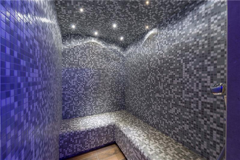 Guests arrive via a quiet road and can park conveniently near the entrance to the house. On entering, the interior reveals a bright and welcoming space, with an open-plan living area and kitchen that leads onto a covered terrace facing the sea. Two spacious double bedrooms are located on the main level with sliding windows that open onto the terrace and pool area. There are two bathrooms with showers as well as a guest wc, while a third, smaller sleeping area for children is tucked into a loft-style gallery. Downstairs, additional features include a Finnish sauna, steam room, and a small gym, perfect for those seeking a wellness element to their holiday. Outside, the grounds include a swimming pool with waterfall and hot tub, framed by loungers and a shaded seating and dining area, all set against a backdrop of olive groves and coastal views.