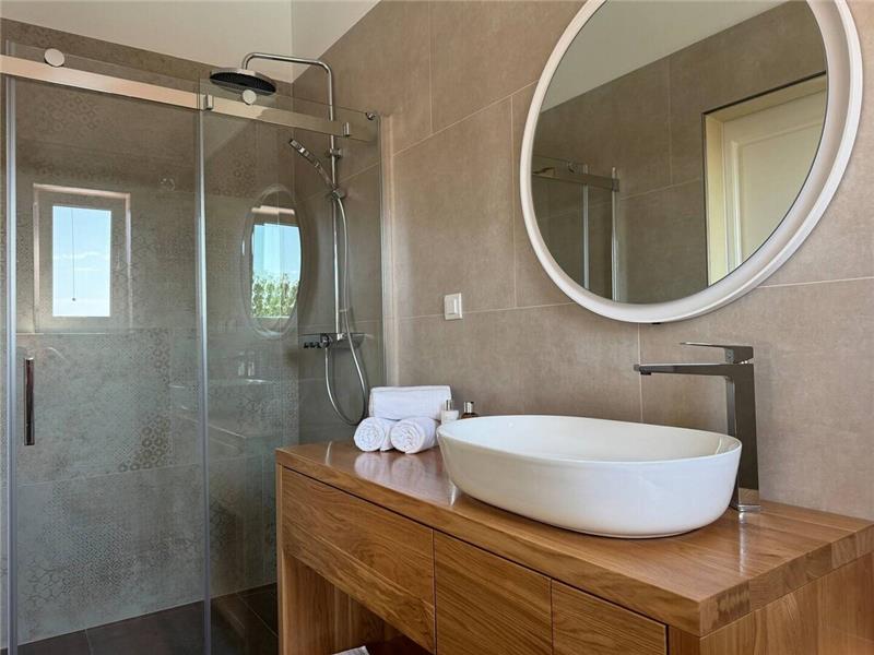 The villa is arranged over two floors. The main entrance opens onto the ground floor, where an open-plan kitchen, dining area, and lounge create a bright and sociable living space. Patio doors lead out to a generous covered outdoor lounge area, which flows seamlessly to the pool and surrounding sun terrace. A cloakroom is also located on this level. An internal staircase leads to the first floor, where there are two double bedrooms and two shower rooms. Outside, guests can enjoy the pool, tennis court, and a barbecue and outdoor dining area, ideal for relaxed alfresco meals.